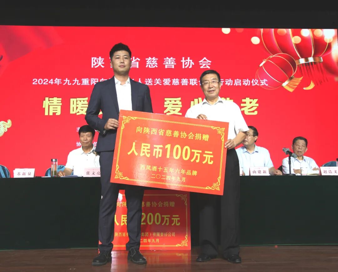 在启动仪式上,陕西延长石油集团向省慈善协会捐赠关爱老人善款200万元;陕西禧福祥集团捐赠100万元;省慈善协会出资40万元,横山区羊中王集团捐赠价值20万元的羊毛马甲;省慈善协会向大荔县捐赠关爱老人款物20万元;渭南市慈善协会向大荔县捐赠关爱老人款物10万元。